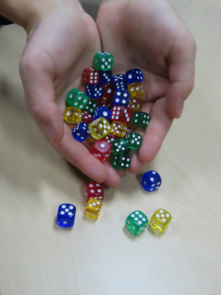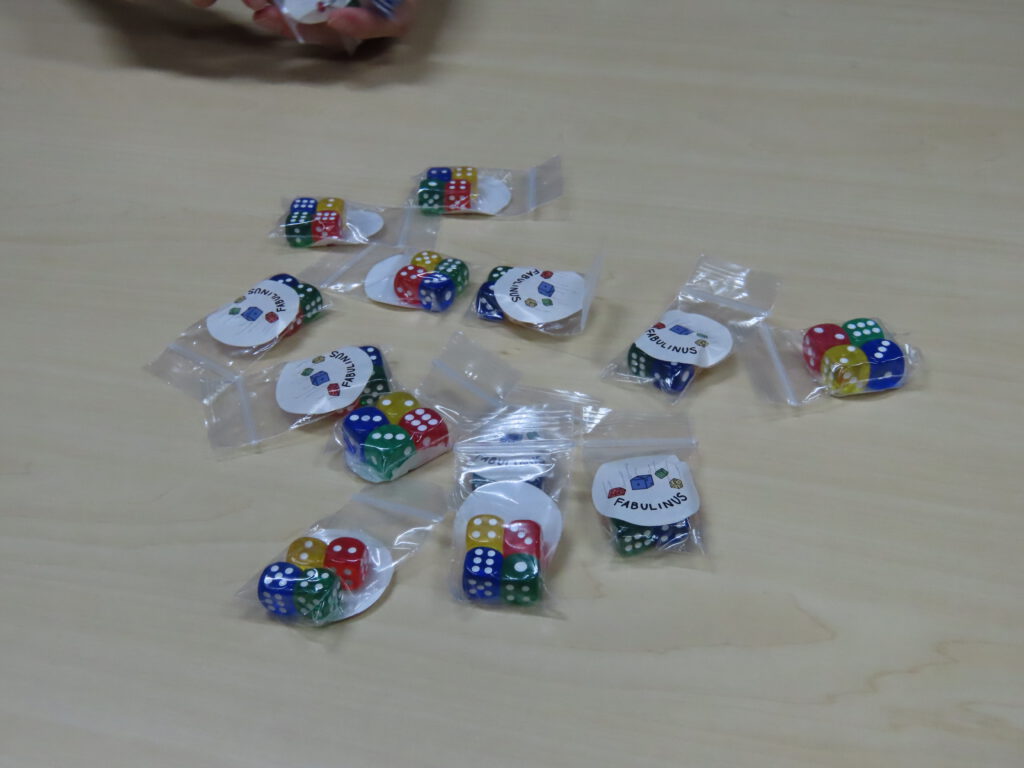 Een setje van 4 gekleurde dobbelstenen met een limited edition fabu-sticker